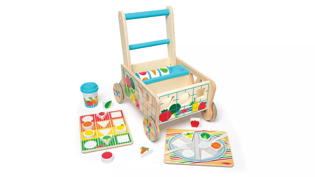 Ta nakupovalni voziček ima interaktivne funkcije, vključno z vrtljivim bobnom s slikami živil, sestavljankami, luknjami za oblike in velikimi kosi hrane. Otroci lahko potiskajo voziček in kose lahko enostavno shranijo v njem, da olajšajo čiščenje.
