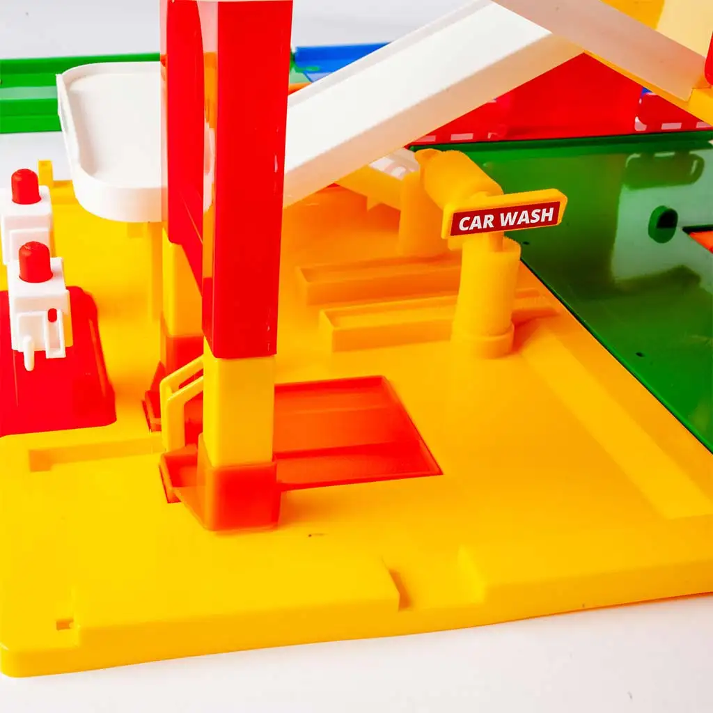 S premičnim dvigalom se vozila zlahka pripeljejo na višje nivoje, od koder se lahko spustijo po rampi. Set vključuje tudi približno 1,5 metra dolg odsek ceste, ki ponuja še bolj raznoliko igralno izkušnjo in omogoča ustvarjanje lastne mestne proge. Zapornica, bencinska črpalka in drugi dodatki še povečujejo realističnost igre, poleg tega pa lahko garažo s pomočjo nalepk tudi personalizirate.