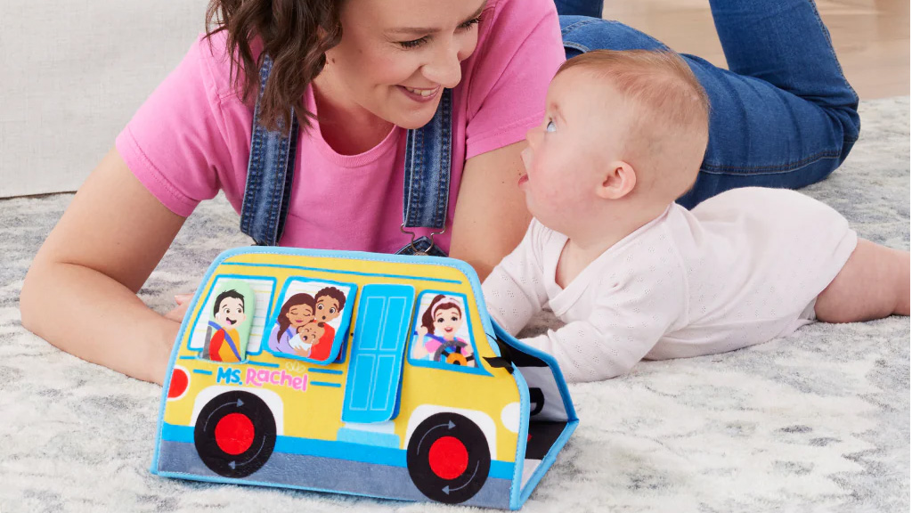 Osem živalskih in kmetijskih tematskih okolij čaka otroke, da jih odkrijejo. Otroci lahko razvijajo svoje "fino motorične spretnosti", dvigujejo kukuc-krinkli zavihke, se igrajo s trakovi, gledajo v ogledalo in uporabljajo priloženi grizalnik. Učna kmetija vsebuje tudi različne "teksture" in "številke".Otroci lahko uživajo v času, ki ga preživijo na trebuhu, medtem ko premikajo fanta gor in dol, trobijo, vihtijo trakaste brisalce in dvigujejo pokrov, da vidijo, kako starši poljubljajo svojega dojenčka. Aktivnostni avtobus je mehak, ima različne teksture za senzorično igro, vsebuje ilustrirano sliko gospe Rachel, ogledalo in visoko kontrastne črno-bele grafike.