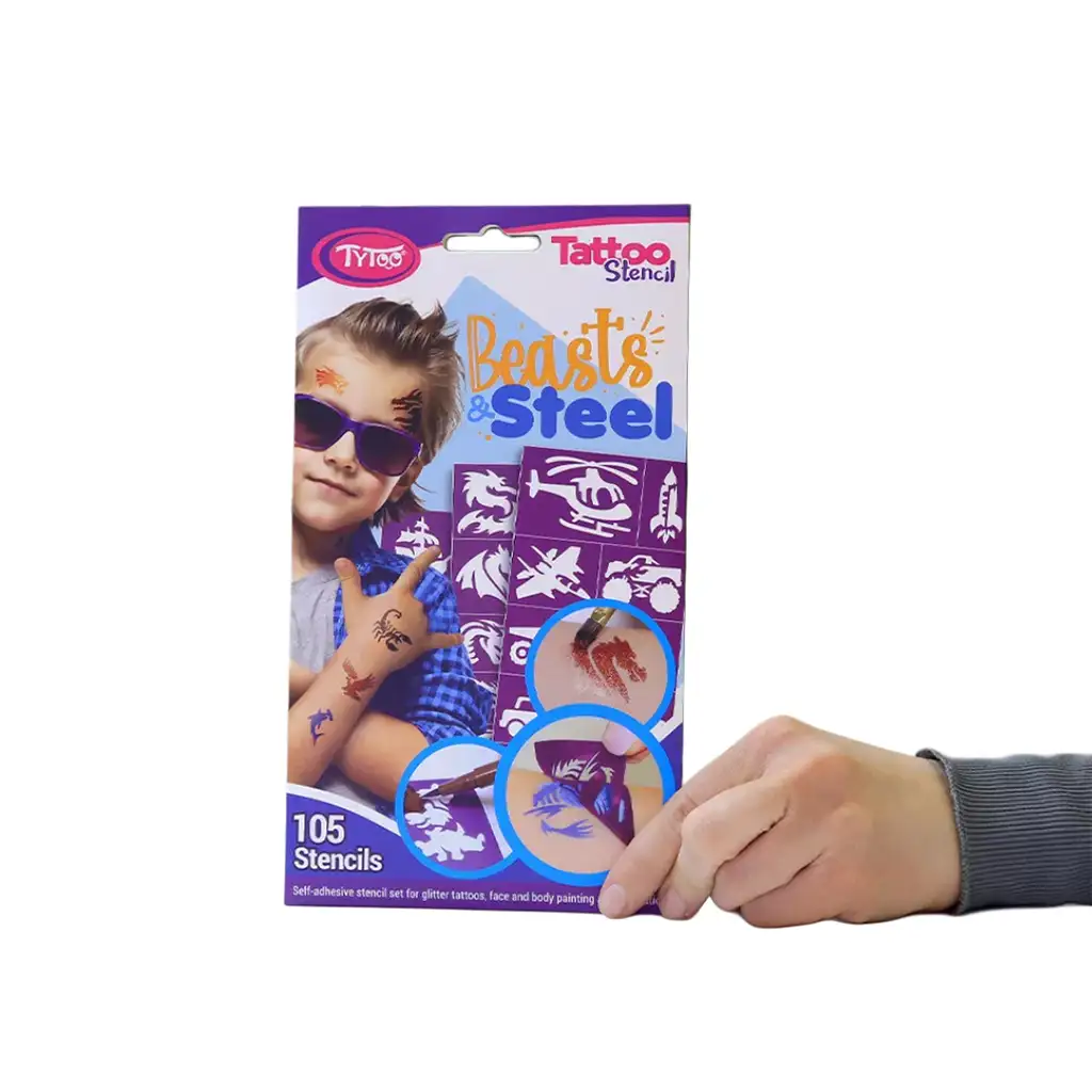 TyToo Beasts & Steel komplet šablonov za bleščeče tetovaže je prava sanje za vsakega dečka (ali pogumno deklico), ki obožuje zmaje, dinozavre, avtomobile, stroje ali strašne plenilce. Ta komplet vsebuje 105 različnih motivov, med katerimi bo vsak otrok zagotovo našel tistega, ki ustreza njegovemu slogu – naj bo to dirkalni avto, leteči helikopter, ognjebrhujoči zmaj ali bojeviti lev.
