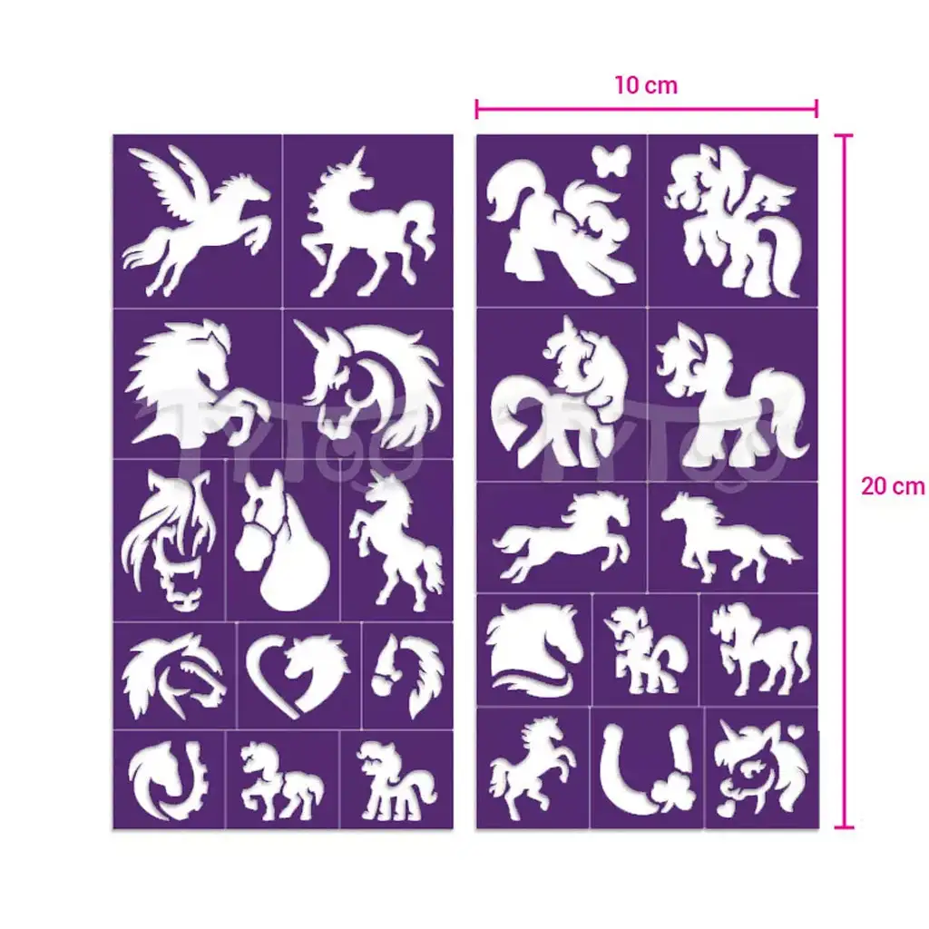 Šablone se preprosto prilepijo na kožo, nato pa jih zapolnite z bleščicami ali barvo za telo. Vzorec se lepo izriše in lahko ostane na koži celo več dni. Na šablonah boste našli vse vrste stilov: prikupne risane ponije, elegantne konjske glave, galopirajoče konje in posebna krilata bitja, tako da bo vsak mali ljubitelj konj našel svojega favorita. Lepljiva podlaga omogoča dober oprijem, vendar se zlahka odstrani s kože, zato je uporaba povsem enostavna.