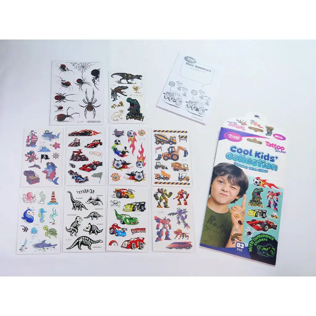 Popestri vsakdan z enim super kul, 83-delnim kompletom tetovažnih nalepk, ki je posebej zasnovan za pogumne in ustvarjalne otroke! Set Cool Kids Collection je poln avtomobilov, dinozavrov, pajkov, piratov, nogometnih žog, gradbenih strojev, robotov in še mnogih drugih razburljivih vzorcev – zagotovljeno je, da bo vsak fantek našel svojega najljubšega! Med nalepkami so tudi svetleče, kovinsko sijoče in takojšnje nalepke, zato igra in izražanje nikoli nista dolgočasna.