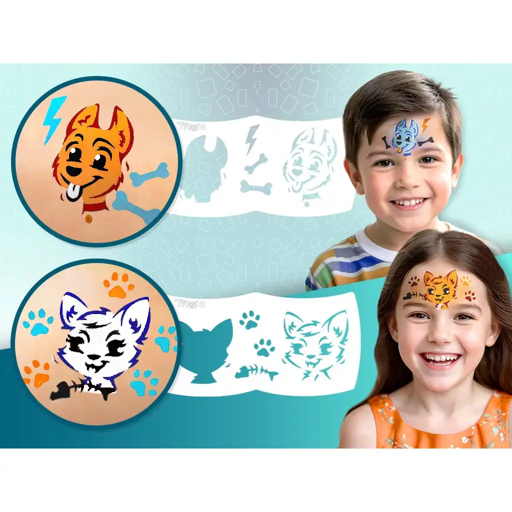 TyToo: Moj prvi komplet za poslikavo obraza – Psi in Mačke je popolna izbira, če tvoj otrok obožuje ljubke hišne ljubljenčke in želi preizkusiti razburljiv svet poslikave obraza. S šablonami z motivi psov in mačk iz kompleta lahko zlahka ustvariš izrazite vzorce tudi brez izkušenj. Preprosto namesti šablono na obraz, uporabi priloženo gobico ali čopič in pred teboj se bo pojavil nasmejan kužek ali muc.