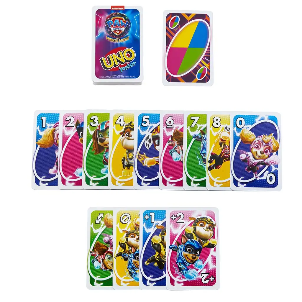 Kartice s tematiko Tačke na patrulji so barvite in enostavno prepoznavne, zato lahko tudi najmlajši uživajo v igri. In ne pozabite: ko vam ostane le ena karta, morate zaklicati ikonični "UNO!", da zmagate v igri!