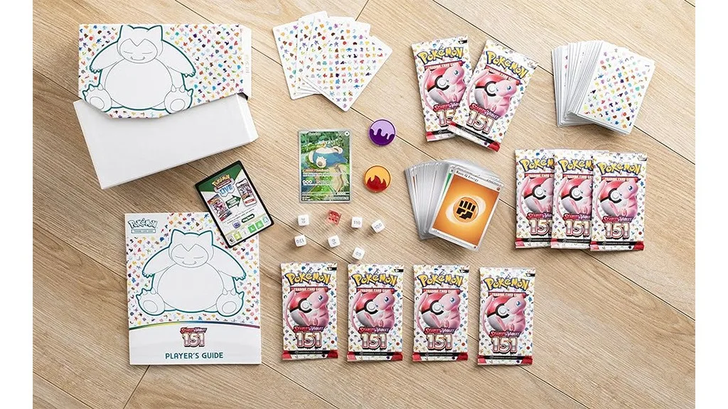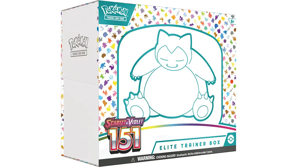 Odpiranje Elite Trainer Boxa Scarlet & Violet — 151 je lahko nekoliko obremenjujoče, samo zaradi številnih zakladov, ki se skrivajo v njem. Preprosto povedano, škatla vsebuje 11 razširitvenih paketov Pokémon TCG: Scarlet & Violet — 151, 65 zaščitnih folij za kartice, 45 kart Pokémon TCG Energy, šest kock za štetje poškodb, dva plastična označevalca stanja, eno folirano promocijsko kartico Snorlax z logotipom Pokémon Center, dodatno folirano promocijsko kartico Snorlax, kocko za metanje kovanca, ki se lahko uporablja na tekmovanjih, vodič za igralce za razširitev Scarlet & Violet — 151, kodo kartico za Pokémon Trading Card Game Live ter škatlo za shranjevanje vsega tega.