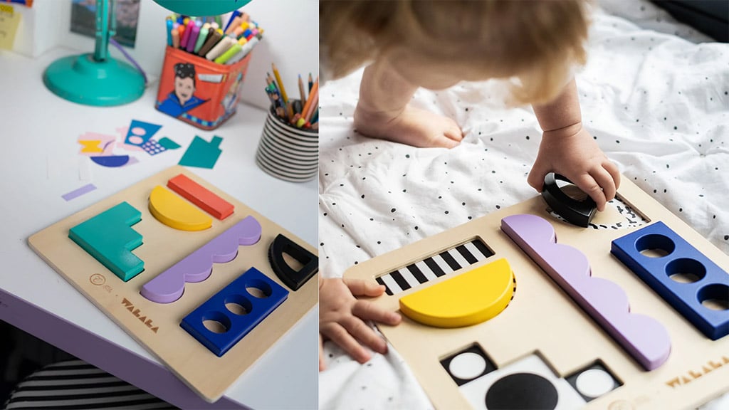Lesena sestavljanka (32 dolarjev) vsebuje šest barvitih oblik, pod katerimi se skrivajo očarljivi črno-beli vzorci. Ti drzni vzorci niso le lepi, temveč temeljijo tudi na znanstvenih osnovah, da pomagajo pri razvoju vida dojenčkov! Malčki lahko vadijo koordinacijo rok in oči s tem, ko postavljajo, zlagajo ali uravnavajo sestavljanke, medtem ko vzorci krepijo njihov vid in zaznavanje. Osupljiva umetnost Walala Studios naredi to igračo resnično posebno, zato je starši ne bodo želeli pospraviti po koncu igre. Ta sestavljanka ni le zabavna, ampak ima tudi razvojni učinek, zato je popolna izbira za vsakega malčka.Ta miselni izziv pomaga okrepiti vid dojenčkov! Redna uporaba igrače razvija vizualno zaznavanje, podpira koordinacijo oko-roka in spodbuja tudi kognitivni razvoj. Posebej koristna je v zgodnjem otroštvu, ko se vid dojenčkov še razvija, saj kontrastni vzorci in barve pritegnejo njihovo pozornost ter spodbujajo gibanje oči. Tako se otroci lažje naučijo osredotočiti in hitreje prilagodijo svojemu okolju.