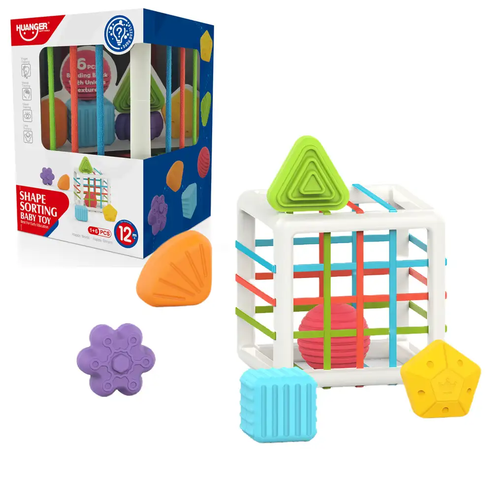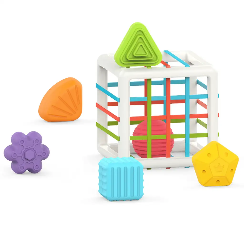 Razvoj dotika in izbiranje oblik je spretnostno razvijajoča se igra, ki je vznemirljiva in poučna igra za majhne otroke. Komplet vsebuje kocko s plastičnim okvirjem, na katerem so na vsaki strani različno obarvane niti, s čimer ustvarjajo različne teksture znotraj kvadrata.
