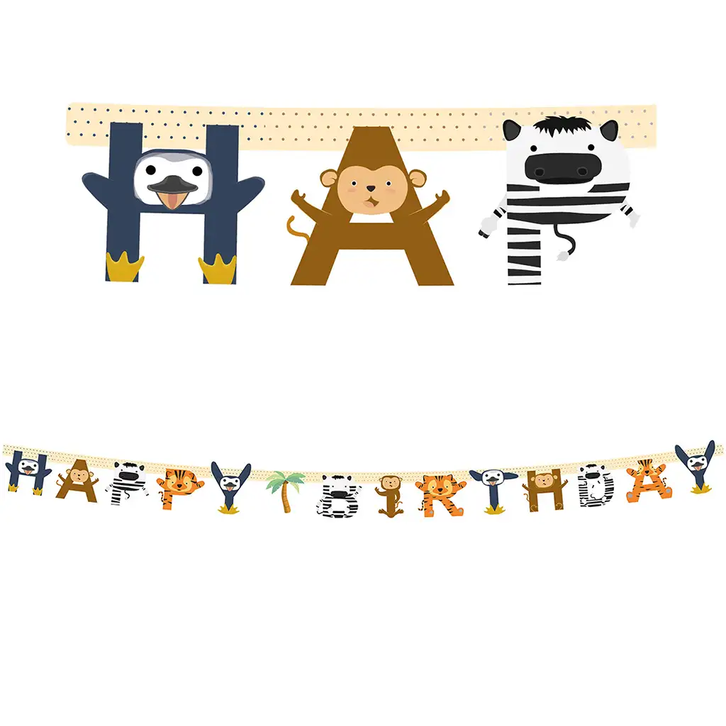 Ta zabaven in barvit vesel živalski rojstnodnevni transparent je popolna izbira, če želite veselo vzdušje z živalsko tematiko za rojstnodnevno dekoracijo! Napis "Happy Birthday" krasijo ljubke džungelske in savanske živali – med njimi pingvin, opica, zebra, tiger in še mnoge druge prijazne figure, ki jih bodo otroci zagotovo oboževali.