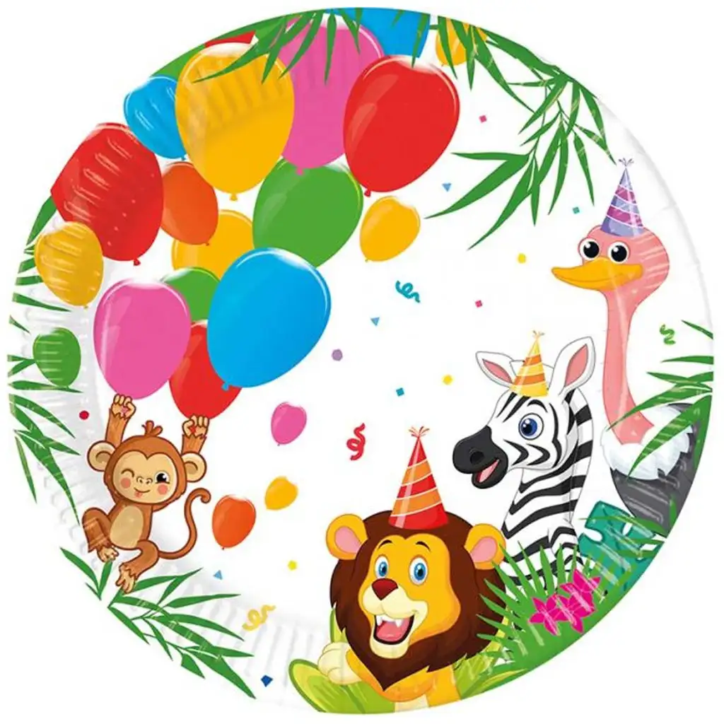 Prinesite vzdušje džungle na otroško zabavo s tem barvitim in zabavnim kompletom papirnatih krožnikov z džungelskim vzorcem! Na krožnikih se otrokom nasmehnejo živahne, na zabavo pripravljene živali – opica, lev, zebra in noj – medtem ko pisani baloni letijo po zraku. Pogled na balone, konfete in živali s party klobučki bo zagotovo narisal nasmeh na obraz vsakega malega gosta in se popolnoma prilega naravni, igrivi atmosferi otroške zabave.