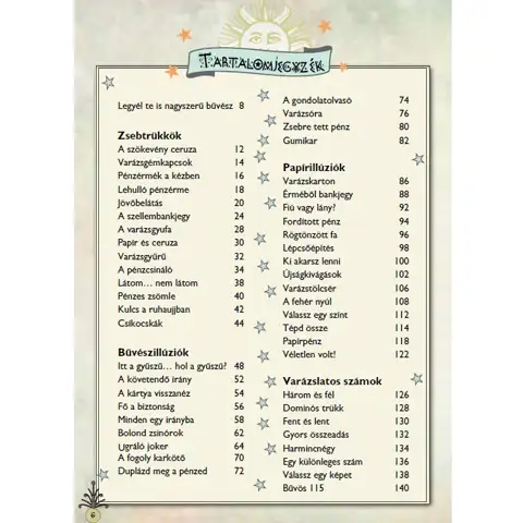 Svet čarovnikov je poln skrivnosti, ki se jih ne moreš naučiti kar tako. Potrebuješ knjigo o čarovništvu, v kateri najdeš vse trike. Ta knjiga vsebuje opise trikov na več kot 200 straneh, poleg tega pa so priložene tudi slike, da jih lažje razumeš. Ena najboljših stvari pri knjigi je, da za trike potrebuješ le predmete, ki jih zagotovo najdeš doma. Nauči se trikov in jih predstavi svoji družini doma ali na prireditvi "Kaj znaš?", v zabavnem vzdušju, in verjemi, da boš imel velik uspeh.