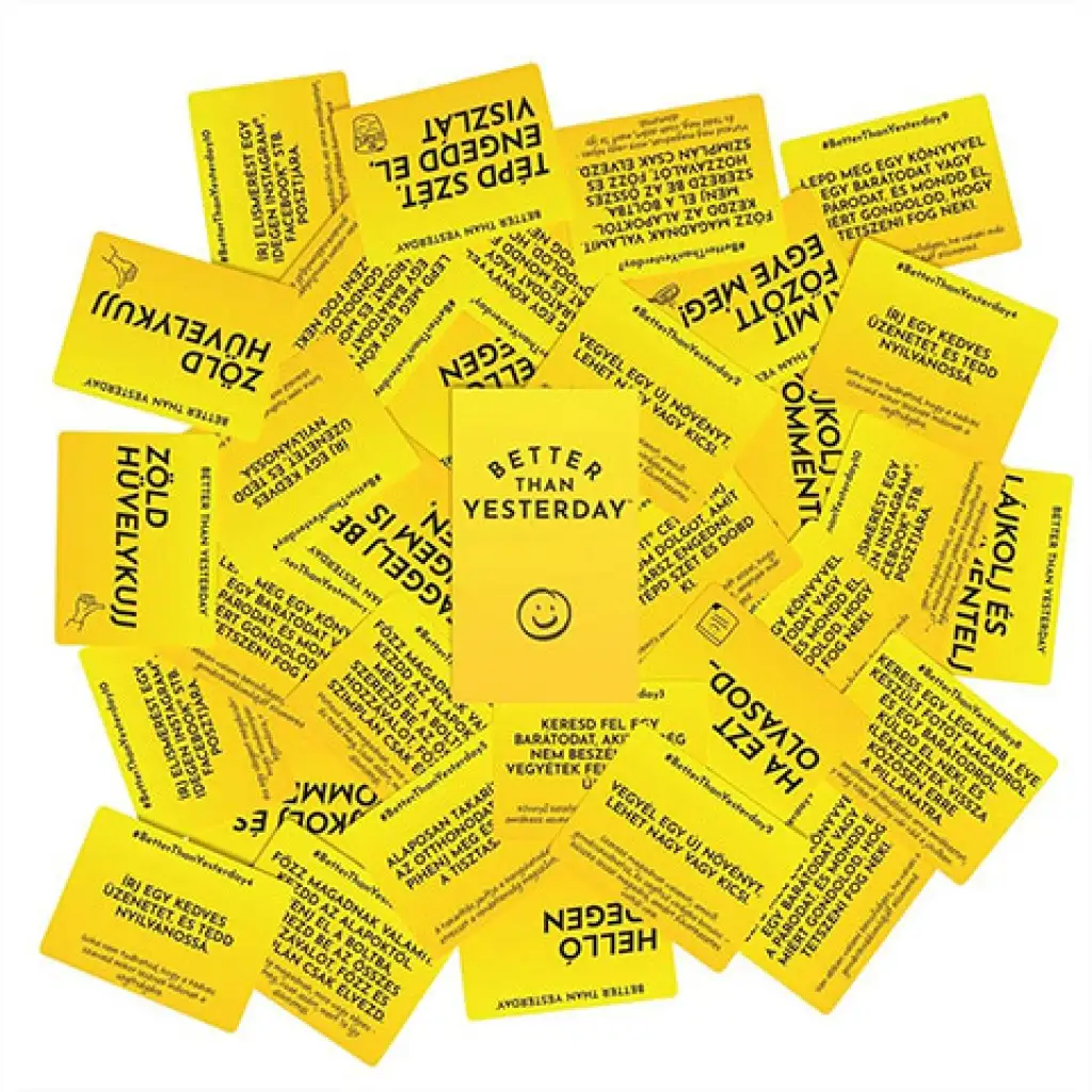 Better Than Yesterday je motivacijska igra, ki vsebuje 365 nalog, ki jih, če jih izvedeš, postaneš bolj samozavesten, izpolnjen in brezskrben. Lahko jo razumeš tudi tako, da vsak dan v letu opraviš eno nalogo. Vsebuje lažje izzive, pa tudi takšne, ki lahko povzročijo težave pri njihovem izvajanju. S to igro s kartami ugotoviš, kdo si, kaj pričakuješ od življenja in tvoja pričakovanja se iz dneva v dan povečujejo. Vsak dan opravi eno nalogo in izpolni vsako.