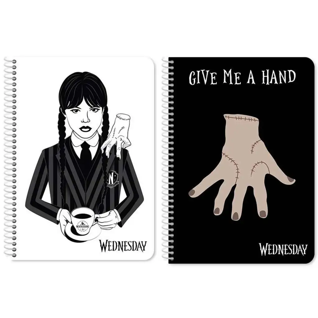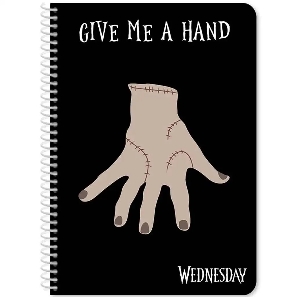 Naredi šolske zapiske bolj zanimive s črtastim spiralnim zvezkom Wednesday! Ta 60-listni zvezek velikosti 17x25 cm je na voljo v dveh osupljivih dizajnih, ki bosta zagotovo navdušila tvojega otroka. Na enem dizajnu je prikazana slavna Wednesday Addams v svoji ikonični podobi, ko v črno-belem oblačilu pozira s skodelico čaja, poleg nje pa je slavni lik roke, Thing. Na drugem dizajnu je napis "Give Me a Hand" in lik Thing, ki zvezku daje edinstven in zabaven videz.