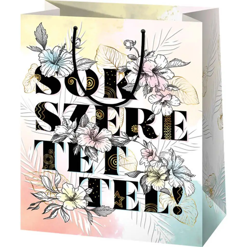 Ta "Z veliko ljubeznijo!" napisana, velika ekskluzivna darilna vrečka, katere dimenzije so 27x14x33 cm, je elegantna in opazna embalaža za posebna darila. Vrečka je okrašena s čistim belim ozadjem, cvetličnimi motivi in zlatimi detajli, ki prenašajo izrazito in intimno sporočilo, idealno za obdarovanje ljubljenih oseb. Kombinacija modernih in klasičnih elementov ustreza tako moškim kot ženskam, mladim in starejšim. Vrečka je izdelana iz kakovostnega kartona, ki zagotavlja vzdržljivost in zaščito daril, ročaji pa olajšajo prenašanje.