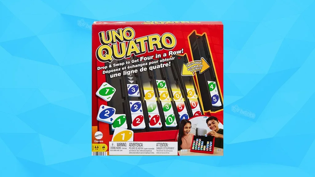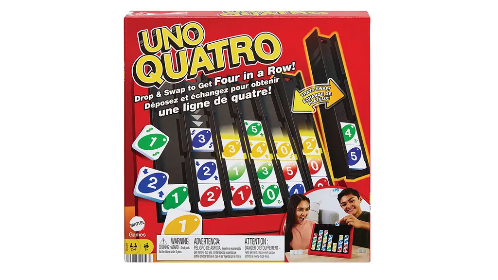 dve igri hkrati? Zdaj lahko!UNO Quatro, namenjen otrokom, starim 7 let in več, ki ga ponuja Mattel, ponuja novo izkušnjo z igro UNO, z zasukom, ki je navdihnjen z igro Connect Four. Igralci izbirajo svoje roke iz vrečke, ki vsebuje majhne ploščice, ki so zelo podobne tradicionalnim kartam UNO. Nekatere ploščice so "akcijske ploščice", ki omogočajo zamenjavo pladnjev, izbijanje kosov in krajo ploščic od drugega igralca.