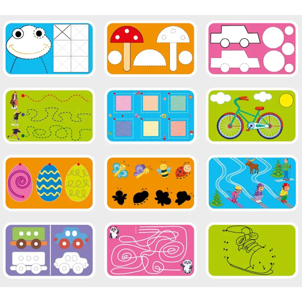 Paket vsebuje 12 dvostranskih kart, ki ponujajo različne vrste nalog, kot so labirinti, povezovanje oblik, vaje za sledenje črtam in prepoznavanje senc. Karte so izbrisljive, zato je naloge mogoče znova in znova reševati s priloženim flomastrom, kar omogoča stalno vadbo in učenje. Naloge so preproste, a vznemirljive in se popolnoma prilegajo starostnim značilnostim malčkov.