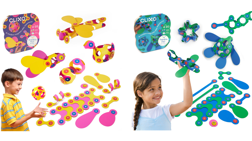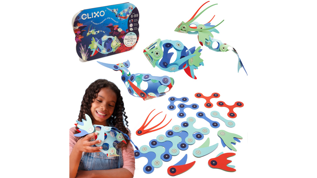 Otroci lahko med potjo ustvarjajo magnetne umetnine iz 15 kosov, ki vsebujejo sedem različnih oblik ter hitri začetni vodnik. Na voljo v zeleno/modrem in roza/rumenem pakiranju.Otroci lahko ustvarijo morske živali s kompletom, ki vsebuje 24 magnetnih kosov, vključno z devetimi Clixo oblikami, kot so plavuti in lovke. Komplet vsebuje tudi kose, ki svetijo v temi!