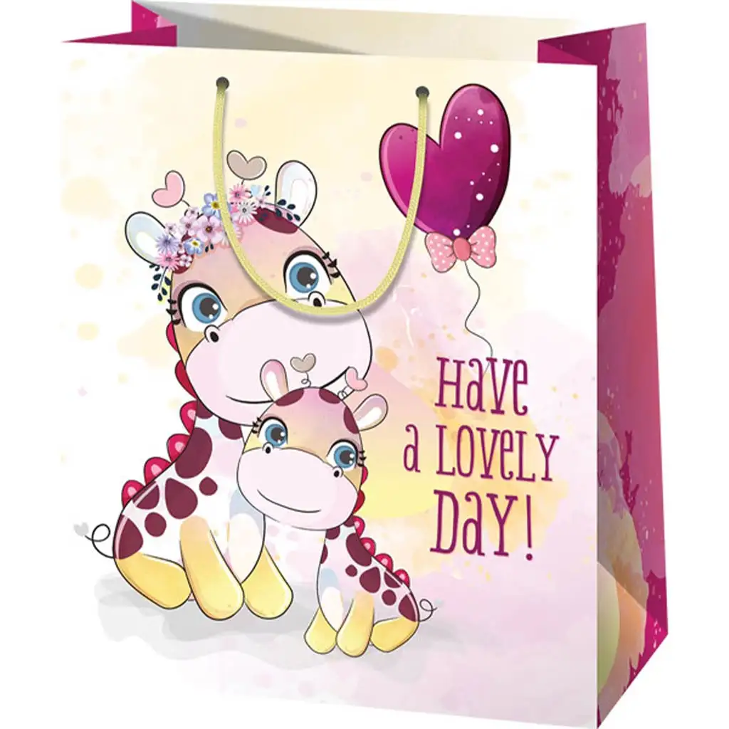 To velika darilna vrečka je odlična izbira za vsako priložnost, ko želimo videti nekoga nasmejanega. Vrečka je okrašena z dvema ljubkima žirafama, ki sta očitno v veseli interakciji, kar še dodatno prispeva k pozitivnemu vzdušju darila. Napis "Have a lovely day" dodaja dodatne dobre želje k darilu in je lahko idealen za rojstnodnevna, imenodnevna ali katera koli druga darila, ki prenašajo pozitivno sporočilo. Velikost 27x14x33 cm zagotavlja dovolj prostora za večja darila, kot so igrače, oblačila ali knjige. Močne vrvne ročaje zanesljivo držijo darilo, ne da bi se bali, da bi vrečka počila.