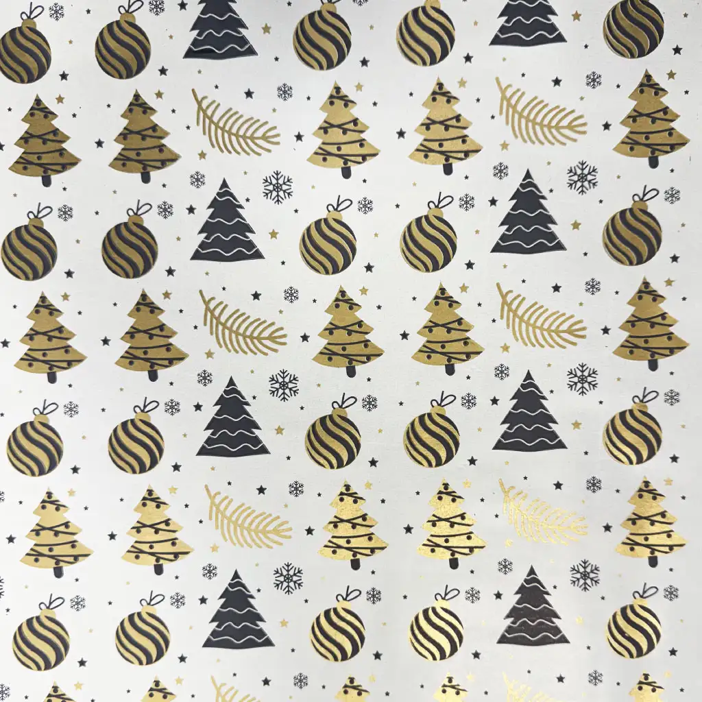 Če res iščeš elegantno in prefinjeno darilno embalažo za božič, je darilni papir »Golden Elegance« popolna izbira. Harmonično menjavanje zlate in črne barve, preprosta božična drevesca, sijoči okraski, vejice smreke in snežinke tvorijo vzorec, ki je hkrati moderen in klasičen. Zlati elementi na belem ozadju dajejo vsakemu darilu pravi premium videz.