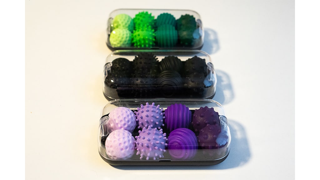 Signets so skoraj popolnoma tihi, ko jih otroci potiskajo, vlečejo in kotalijo. Silikonska zunanja lupina je mehka in prožna. Prijeten občutek je, ko ga kotalite v dlani ali jih potiskate in vlečete v velikem kupu, kot smo to počeli na Toy Fair-u. Signets so na voljo v sedmih barvah: črna, zelena, vijolična, modra, turkizna, rdeča in siva. Štiri različne teksture zagotavljajo različne občutke, ki med uporabo zagotavljajo mir in osredotočenost.
