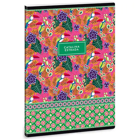 S tem drznim Catalina Estrada karo zvezkom lahko zahvaljujoč živahnim barvam ter tukan ptici in tropskemu rastlinju, kar daje vzorec zvezka, med otroške šolske potrebščine pričaramo tropsko svežino in veselje. Zvezek je velikosti A5, s skupaj štiridesetimi listi in tako se lahko dolgo uporablja. Ovitek je iz 350-gramskega papirja, ki je tako zelo trpežen in dobro varuje notranje liste pred fizičnimi poškodbami, poleg tega pa je prejel tudi 3D UV lakiranje, s katero je videz zelo edinstven.