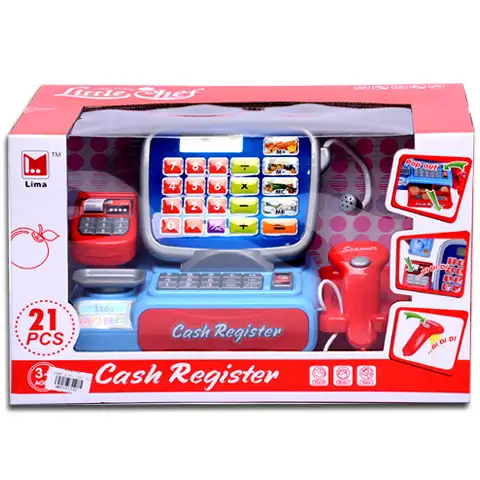 Z barvno malo blagajno si ti lahko vodja supermarketa! Elektronska blagajna je opremljena z zaslonom in delujočimi gumbi, ki se lahko uporabljajo, kot pri pravi blagajni ter tudi z odpiralno kaso, v katero lahko otroci vstavljajo kovance in bankovce. Blagajna razpolaga tudi z bralnikom črtnih kod in tehtnico, kar otrokom omogoča realistično doživetje nakupovanj.