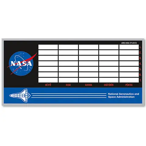 Ta urnik, okrašen z NASA logotipom in raketoplanom, bo všeč predvsem majhnim fantom, ki si močno želijo biti astronavti, hkrati pa jim pomaga tudi pri tem, za katero uro se je treba pripraviti. Ars Unin urnik je iz enega lista, vendar je prejel dvostransko izvedbo, tako se lahko na njem označi tako teden A kot tudi B. Urnik je v madžarščini, iz 250-gramskega polsijajnega tiskarskega kartona, s čudovitimi barvami, nanj pa se lahko piše s kemičnim in tudi grafitnim svinčnikom. Urnik se lahko vstavi v večino peresnici, da bo vedno pri roki in pred očmi.