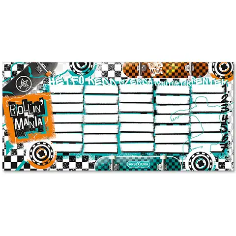 Urnik pride šolarjem vedno prav, saj lahko nanj zapišejo pomembne informacije. To je lahko malčkom še bolj zanimivo, če vsebuje tudi kakšne motive, tako bo ta urnik Rollin Mania z deskarskim dizajnom popolnoma ugajal. Urnik Ars Una je iz enega samega lista, a je prejel dvostransko izvedbo, tako lahko na njem označiš teden A in tudi B. Urnik je v madžarščini, iz polsijajnega umetniškega tiskarskega papirja težine 250 gramov, s čudovitimi barvami, nanj pa lahko pišeš s penkalom in tudi svinčnikom. Urnik lahko vstaviš tudi v večino peresnic, tako je lahko vedno pri roki in pred očmi.