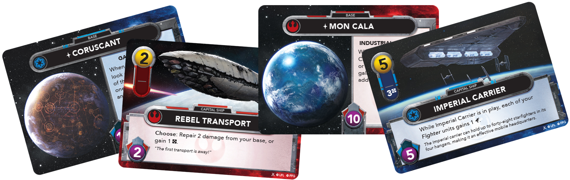 Seveda so tudi baze same dejavnik vaše strategije. Uporniki vedno začnejo igro z Dantooinom, Imperij pa z Lothalom, nobeden od njiju pa nima nobenih inherentnih sposobnosti; če pa je vaša baza uničena, lahko izberete drugo bazo iz svojega osnovnega kompleta. Vsaka baza ima svojo posebno sposobnost, kar pomeni, da morate skrbno izbrati drugo in tretjo bazo, da povečate njun potencial. Ne pozabite, da če je vaša tretja baza uničena, izgubite igro!