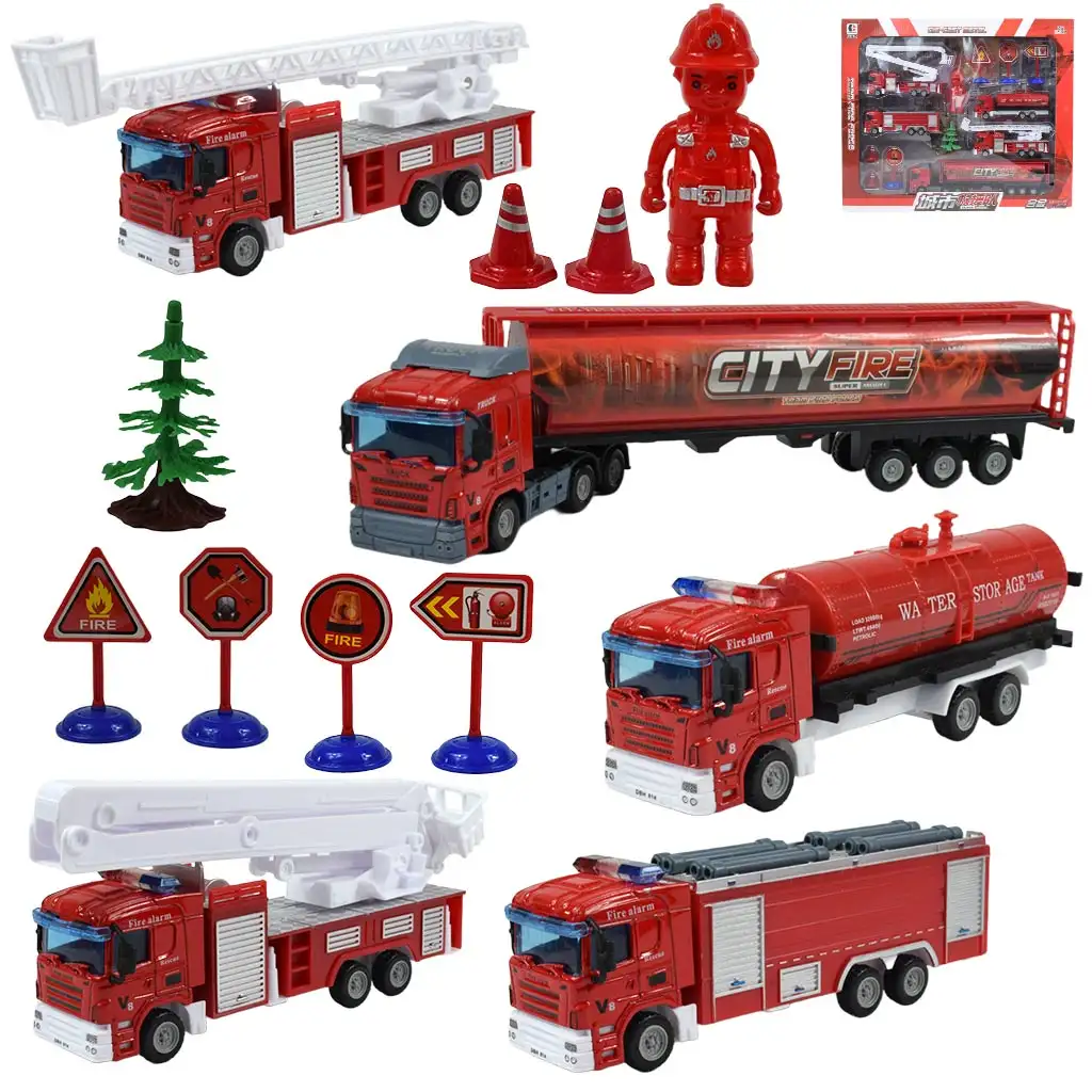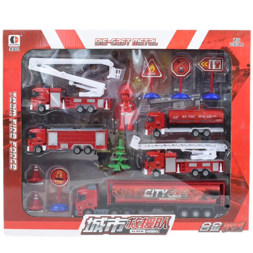 Gasilski igralni set je izstopajoče bogat in raznolik. Sestava vsebuje naslednje: kamion, dve gasilski vozili z lestvijo, gasilsko vozilo z rezervoarjem, štiri različne table, figurico in drevo. Različna vozila in številni dodatki dajejo otrokom možnost, da razvijejo svojo kreativnost in moč domišljije ter odigrajo različne reševalne akcije.