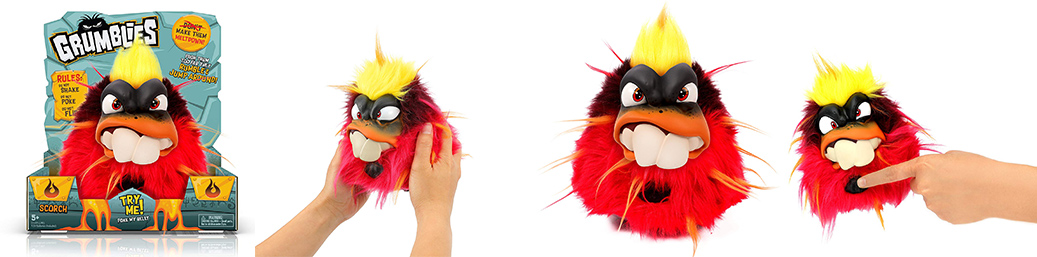 Torej pozabi na objemanje in stiskanje, s katerimi pogosto obdarujete ta mala plišasta bitja in se pripravite na besne reakcija. Če pošasti streseš, jih obrneš na glavo ali pritisneš gumb na njihovem trebuhu, se bodo odzvali z več kot 40 različnimi zvočnimi efekti in se bodo tresli z veliko silo, kar ne pomeni nič drugo, kot da je vulkan na robu izbruha ali pa zemlja tresenja.