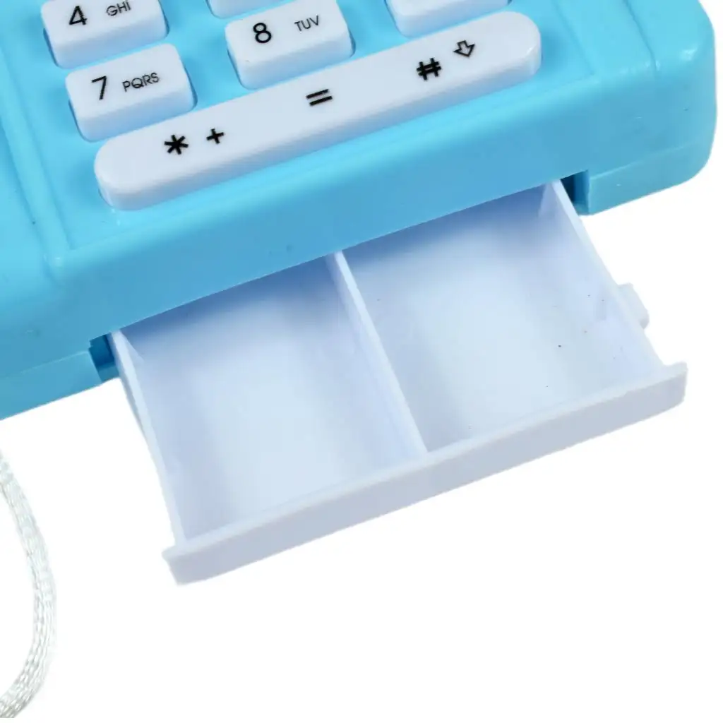 Med igro se lahko otroci naučijo, kako se obnašati v resničnem nakupovanju, medtem ko uživajo v igri vlog. Izdelek je na voljo v modri ali roza barvi, ki ju lahko izberete v komentarju ob naročilu. Velikost blagajne je 12,5x10x9,5 cm in je izdelana iz plastike, zato je uporaba enostavna in varna za punčke.
