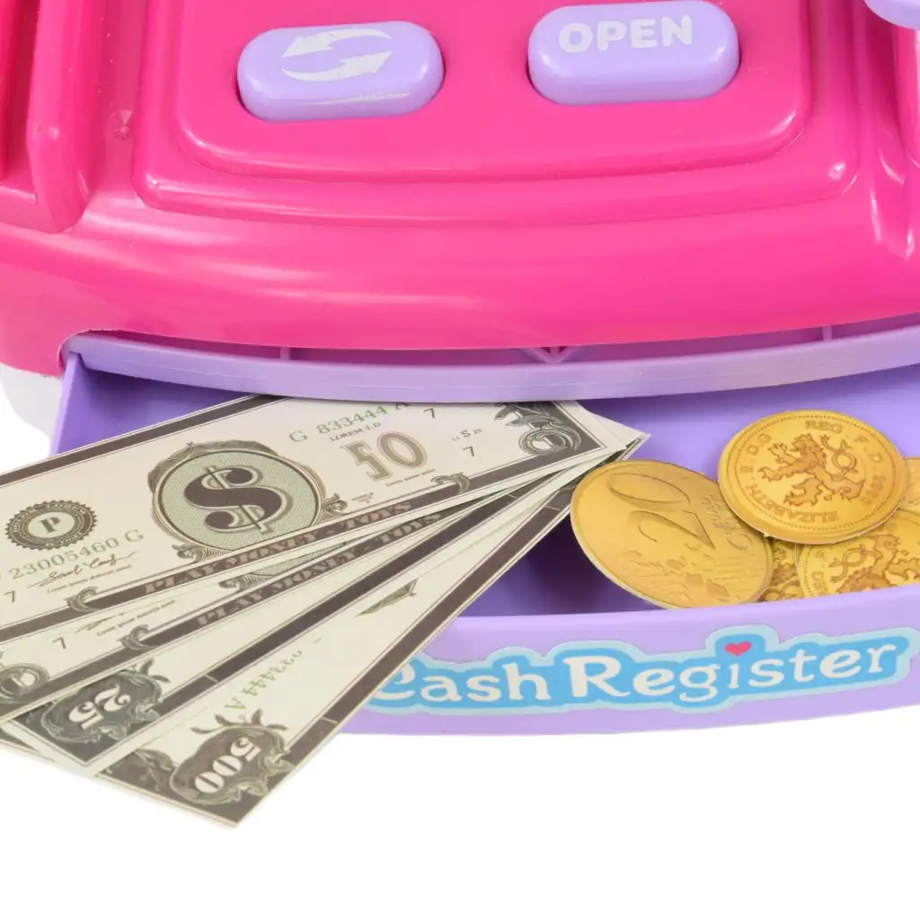 S to majhno blagajno velikosti 23 x 14 x 11 cm se lahko otroci na zabaven način učijo osnovnih matematičnih veščin in finančnega znanja. Zvoki, ki jih proizvajajo čitalnik črtne kode in gumbi, ter funkcija čitalnika bančnih kartic naredijo igralno izkušnjo še bolj realistično.