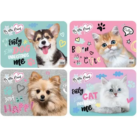 Izdelke My Little Friend krasijo ljubki kužki in muce, tako bodo zagotovo ljubljenci otrok, zahvaljujoč dvostranski zasnovi pa lahko od časa do časa menjujejo tudi sliko. Namizno podlogo lahko otroci položeno na vrh pisalne mize uporabljajo kot podstavek in tako obvarujejo mizo pred praskami, poškodbami, da niti ne omenjamo, da podstavek zagotavlja veliko mehkejšo površino kot namizna plošča in tako bo tudi pisanje veliko udobnejše, učenje pa lahko otroci opravijo v družbi psov ali mačk.