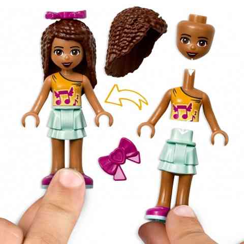 Spoznaj Andrejo in pokukaj v njeno spalnico, kjer lahko odkriješ številne stvari. Na primer, da Andreja obožuje glasbo in odlično igra na kitaro, klavirju in tudi na veliko veselje Pepperja, malega papagaja, zelo lepo poje. S pomočjo kompletov LEGO Friends se otrokom ponuja priložnost za čarobno potovanje in spoznavanje prebivalcev čarobnega mesta Heartlake City in najbolj priljubljenih mest. To mesto je lahko prizorišče veliko avantur, pri katerih je dobesedno le otroška domišljija omejitev.