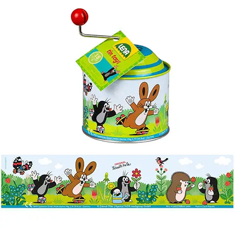 Z motivi Krtka opremljena glasbena skrinjica je lahko odlična izbira za otroke, s pomočjo mehanike v notranjosti lahko namreč sami sprožijo melodijo. Zahvaljujoč kovinskemu mehanizmu ga lahko uporabljajo tudi najmanjši, saj je zares trpežna in je brez drobnih sestavnih delov. Z vrtenjem ročice na vrhu skrinjice lahko takoj zaslišimo melodijo, ki ima lahko na malčke tudi uspavalni učinek. Baterije in zunanje napajanje niso potrebni, deluje na mehanični način.