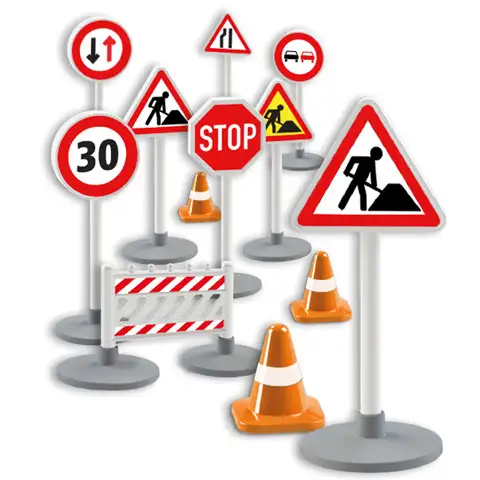 V kolikor imaš v svoji zbirki že številna vozila, potem je skrajni čas, da si priskrbiš tudi nekaj prometnih znakov, s pomočjo katerih boš lahko urejal promet v okolici gradbišča. Komplet vsebuje vse potrebne znake, od omejitev hitrosti in opozorilnih znakov za gradbišče do STOP znakov. Ne manjkajo niti usmerjevalne boje. Certifikat Spiel Gut je zagotovilo za visoko kvalitetne osnovne materiale in trpežno izdelavo, kot tudi za igralna doživetja, iz otroške perspektive najpomembnejšo stvar.