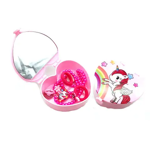 Punčke boste lahko povsem sigurno z lahkoto očarali s tem paketom lepotilnega seta, saj je celoten komplet vstavljen v roza posodo oblike srca, ki je okrašen z vzorci samoroga in mavrice eden od ljubljencev deklet. Ko odpremo pokrov majhne škatle naletimo na nakit, kot so ogrlica, zapestnica, gume za lase in druge drobnarije. Dekleta si lahko s tem kompletom naredijo za sebe vesel in dekliški nakit.