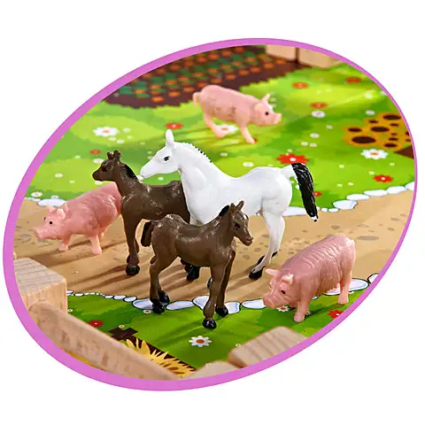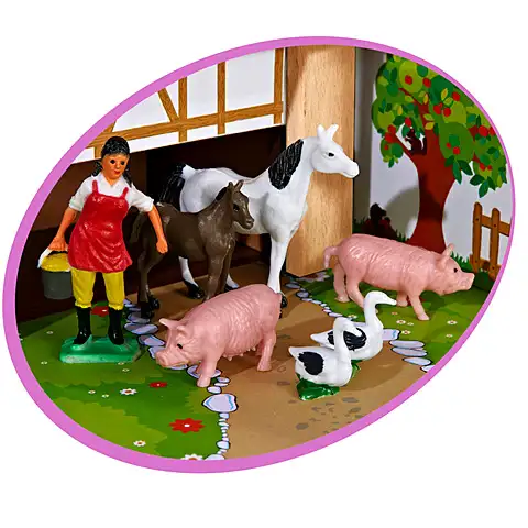 Valjaj se s prašiči v blatu, usmeri konje v hlev med slabim vremenom ali pa nahrani teleta! Na kmetiji je ogromno dela, ki ga je potrebno opraviti, da živali v ničemer ne občutijo pomanjkanja. Na kmetiji, sestavljivi iz lesenih elementov, se lahko otroci z že znanimi domačimi živalmi na trdni igralni površini ali tudi v lesenih zgradbah. Kmetijo lahko tudi obdajo z ograjo in tako preprečijo pobeg živalim.