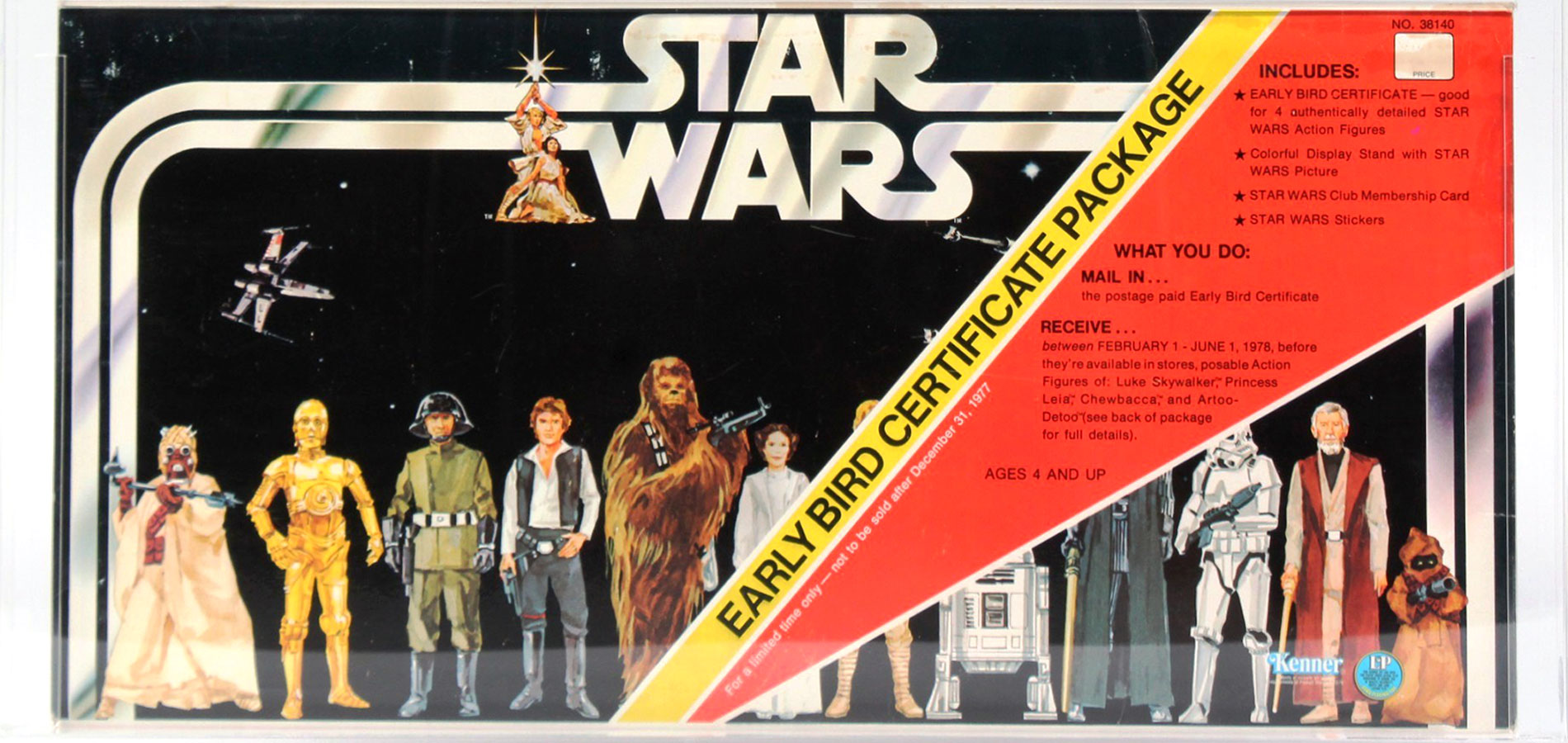 Čeprav je bil originalni film Vojna zvezd predvajan maja 1977, je bil Kenner nepripravljen na filmski uspeh brez primere in veliko povpraševanje po igračah, predvsem zato, ker George Lucas ni hotel dati dizajna likov in vozil, ker se je bal, da bi filmski/TV konkurenti plagiatizirali njihove stvaritve. Ker se niso mogli pravočasno oskrbeti z donosno božično tržnico, so namesto tega prodali »paket potrdil o vnaprejšnjem nakupu«, ki je vključeval potrdilo, ki ga je bilo mogoče poslati Kennerju in unovčiti za štiri akcijske figurice iz Vojne zvezd. Prve štiri like, ki so se začeli prodajati, so bili Luke Skywalker, princesa Leia, Chewbacca in R2-D2. Škatla vključuje tudi stojalo za diorame, nekaj nalepk in člansko izkaznico Kluba oboževalcev Star Wars.