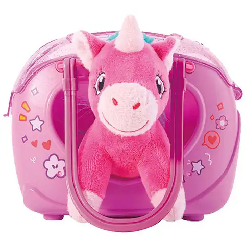 Torbica samorog bo zagotovo ena od velikih ljubljenk punčk, saj se tu v torbi nahaja pravi majhni poni, s katerim se lahko odigravajo zabavne zgodbe. Praktična majhna torba je že zaradi mode odlična izbira, vendar pa bo v njej počivajoč, mehak plišasti samorog punčke začaral v enem samem hipu. V torbici se nahaja tudi glavnik, tako lahko malčke lepo počešejo grivo in rep samoroga.