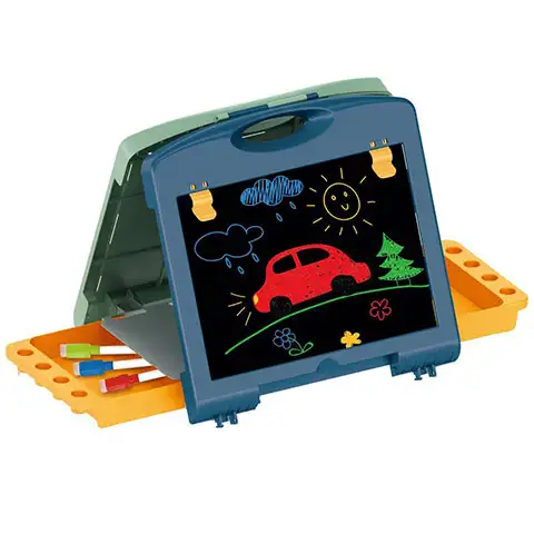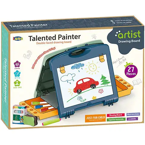Za kreativne otroke bo odlična izbira dvostranska risalna tabla, s katero lahko prosto ustvarjajo in v hipu kjerkoli izoblikujejo risalni studio. Komplet se nahaja v plastični torbi z ročico, ki pa se lahko odpre z enim samim gibom in se lahko pritrdi tudi v stoječem stanju. V notranjosti škatle so tako koristne drobnarije, kot izbrisljivi barvni flomastri, goba ter na zadnji strani table izoblikovano družabno igro Kače in lestve potrebne figurice in metalna kocka.