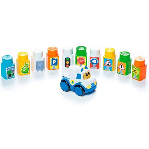 Otroci bodo v igri s tem kompletom zagotovo zelo uživali, v škatli najdejo namreč velikansko igralno preprogo, avtomobilček in tudi nekaj prometnih tabel. Prometne table so natisnjene na gradbene kocke in tako se te lahko uporabi tudi za gradnjo, igralna preproga pa prikazuje mestne ulice, kar ponuja vsakomur izjemna igralna doživetja. Molto Bloks gradniki so zasnovani izključno za majhne otroke in tako vsebujejo velike sestavne elemente, ki jih otroci ne bodo mogli pogoltniti in jih bodo lahko zahvaljujoč meram zlahka prijeli v roke ter tudi njihovo sestavljanje jim ne bo delalo težav.