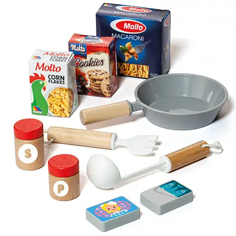 Z igralnim setom, ki vsebuje dobro opremljen kuhinjski pult in tudi nekaj pripomočkov, lahko iz otroške sobe v nekaj trenutkih pričaramo osupljivo kuhinjo. Na pultu sta mikrovalovna in prava pečica, pomivalno korito in plinski štedilnik, med dodatki pa najdemo posodo, leseno žlico in tudi metlico za stepanje. Lesene Molto igrače so izdelane v skladu s FSC, iz trajnostno izbranih materialov in z okolju prijaznim proizvodnim procesom. Lesene igrače Molto Nature ročno poslikane z nestrupenimi barvami na vodni osnovi in izpolnjujejo najstrožje varnostne standarde, tako da se otroci lahko varno igrajo z njimi.