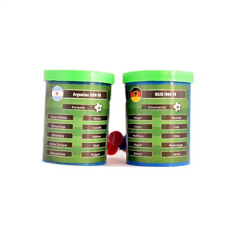 Ta set nogometa z gumbi te bo malce popeljal nazaj skozi čas, vse do finala SP 1986, kjer se je ekipa Argentine pomerila z izbrano vrsto Nemčije, na koncu tekme pa je lahko veliki Maradona dvignil zlati pokal. Igro lahko igrajo 2-4 osebe in cilj igre je, da z igralci nogometa z gumbi odigrate tekmo svetovnega prvenstva. V setu se nahaja najboljših 11 igralcev dveh nogometnih ekip, poleg tega tudi 4 žoge za nogomet z gumbi, tako potrebujete le še vrata. Lahko si ogledate takratno nogometno tekmo in odigrate pomembne situacije, gole ali odigrate pravo tekmo. Poleg vsega tega se lahko veselite tudi nagrade, vstavili smo namreč tudi 22 nalepk z igralci, ekipi Feyenoord Rotterdam in Glasgow Rangers iz leta 2017.