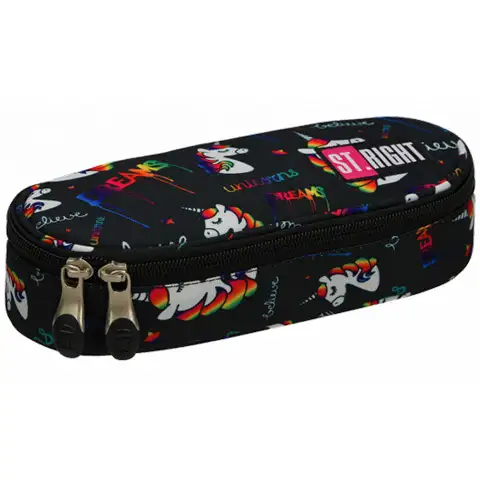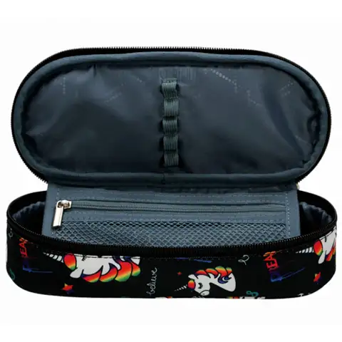 Ta peresnica je hkrati dovolj kul in obenem tudi dovolj dekliška, na črni osnovni barvi so namreč samorogi z grivo in napisi v vseh barvah mavrice. Zahvaljujoč ovalni obliki bo v njej prostora za ogromno pisal, najbolj pogosto uporabljena se lahko pritrdijo tudi na pokrov in bodo tako vedno pri roki. Mrežasti žep je namenjen za drobnarije, katere tako ne bo potrebno iskati na dnu peresnice.
