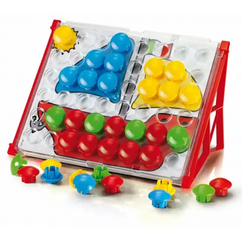 Ta izjemni komplet bucik bo zagotovo tudi tebe navdušil. Z izključno za male otroke razvito igračo bo zabava v pravi užitek. Zahvaljujoč večji meram bo tudi oprijem za manjše rokice občutno lažji. Živahne barve in vesele oblike pa bodo zagotovo pričarale nasmeh na usta malčkov. Uporaba igrače je sila enostavna, kljub temu obljublja zabavno igro: s pomočjo šablone, nameščene pod prosojno načrtovalno tablo bo otročja igra slediti barvam, sestavljanje posamezne slike bo tako otrokom zagotovo prineslo občutek uspeha. Tabla je opremljena tudi s podstavkom, za še bolj udobno ustvarjanje.