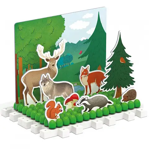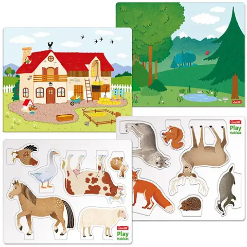 Ta živalski razvijalni komplet bucik otrokom prinaša nešteto novih igralnih možnosti, kot so do sedaj bili navajeni. Za osnovo igri sodi dobro znana luknjasta tabla in zelene bucike, ki upodabljajo polje ali travnata polja kmečkega sveta. V odprtine med bucikami se lahko zlahka vstavijo ozadja in k kompletu priložene živali, ki kot da bi svobodno postopale po travnatem območju. Montessori je nova serija Quercetti razvijalnih igrač, navdihnjena z delom slavne učiteljice Marie Montessori, tako nastajajo igrače in sredstva, ki imajo zares razvijalni učinek na spretnosti otrok. Komplet je v biološko razgradljivi embalaži.