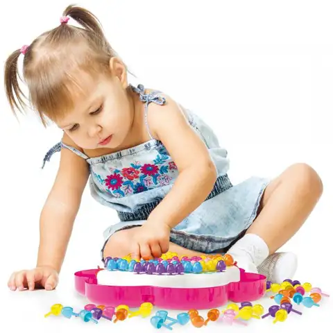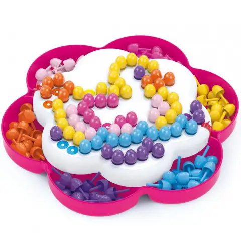 Bucike v obliki rože omogočajo ustvarjanje najbolj raznolikih slik, s pomočjo 150 bucik v 6 različnih barvah. Na začetku lahko mirno delaš na podlagi šablon, komplet vsebuje tri različne, po določenem času pa pusti prosto pot svoji domišljiji. Odlična zabava, hkrati razvija otrokovo kreativnost, razpoznavanje barv in koncentracijo.