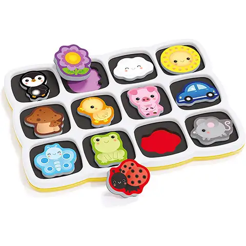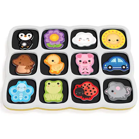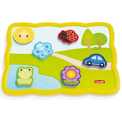 Ta dvostranska magnetna sestavljanka je odlična izbira za majhne otroke, na eni stran table je namreč ducat ljubkih slik, ki jih morajo otroci poznati in na njih namestiti ustrezne sestavne dele. Posamezni deli so dovolj debeli, mehki in zahvaljujoč magnetu na zadnji strani se čarobno prilepijo v roke. Na drugi strani table je barvna panoramska slika, na katero lahko otroci poljubno nameščajo sestavne dele ustvarjajoč čudovito zgodbo, prizore katere lahko prosto spreminjajo.