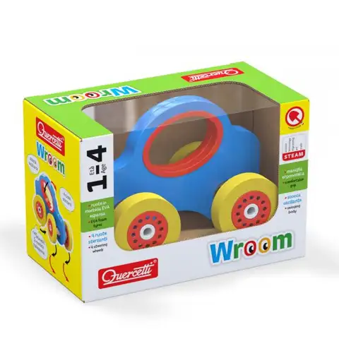 Ta majhni avtomobil zagotavlja veselja polne trenutke, omogoča namreč premik ne le naprej in nazaj, ampak zahvaljujoč magično vrtljivemu lesenemu telesu tudi na stran. Kolesa so izdelana z razširjeno EVA tehnologijo, so odstranljiva in se jih lahko očisti, kar zagotavlja maksimalni oprijem na kateri koli površini, znotraj ali zunaj. Vozilo je neslišno in ne uničuje tla. Vsa Wroom vozila so edinstvenega ergonomskega dizajna, z ovalno ročico na zadnji strani za lažje gibanje zapestja in obenem prispeva k razvoju ročnih spretnosti.